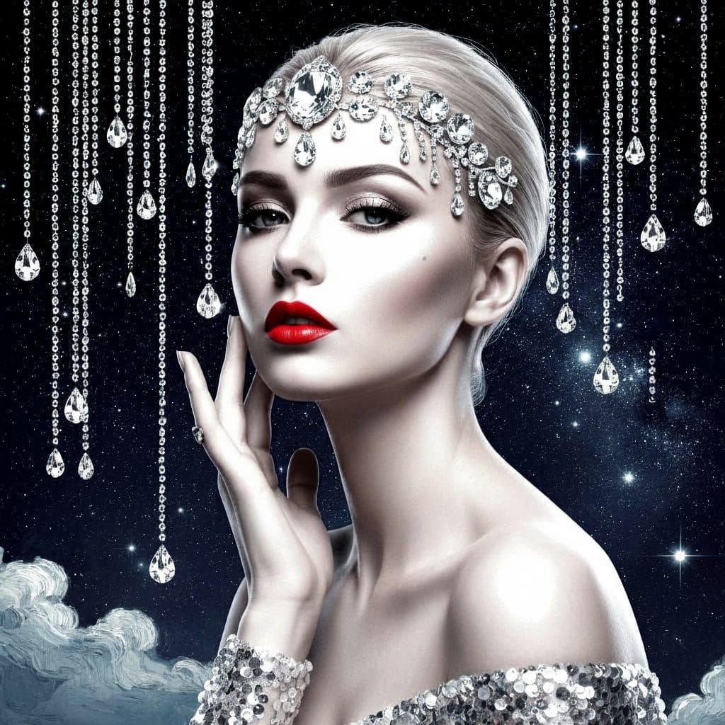This image shows a beautiful woman with porcelain skin under a magical starry sky. Sequins and diamonds fall from above in this photorealistic digital painting with elements of Van Gogh's style.