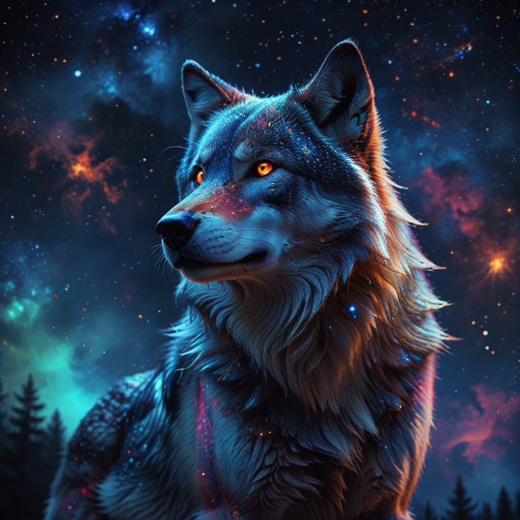 A striking picture of a majestic wolf standing tall beneath a starry night sky. This vibrant digital artwork, rendered with soft, ethereal lighting, captures a dreamlike scene in a surreal style.