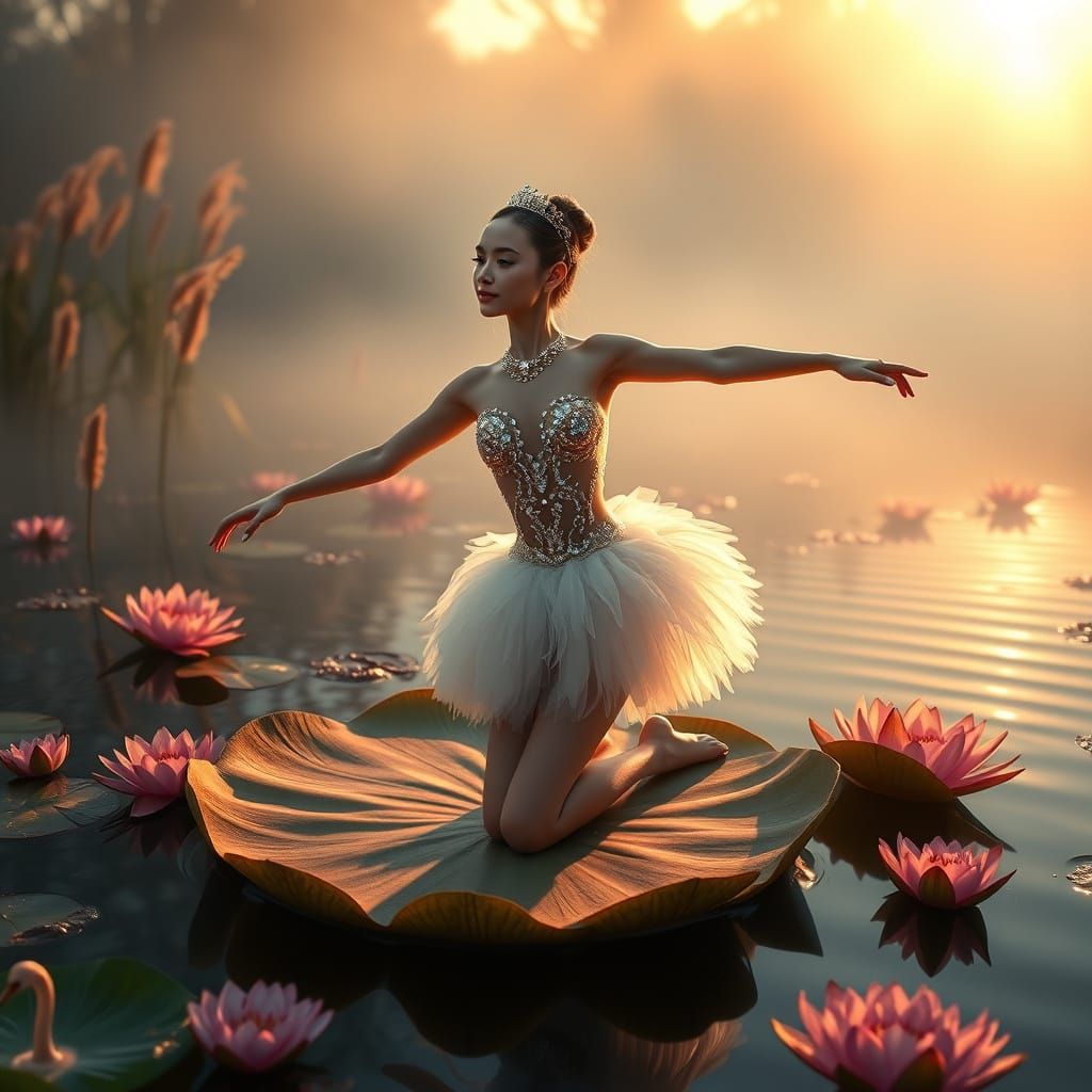 A striking picture of a ballerina in a beaded swan costume, kneeling on a lily pad in a misty pond. Golden light accentuates the intricate details in this brilliant, maximalist scene with Disney-esque fantasy.
