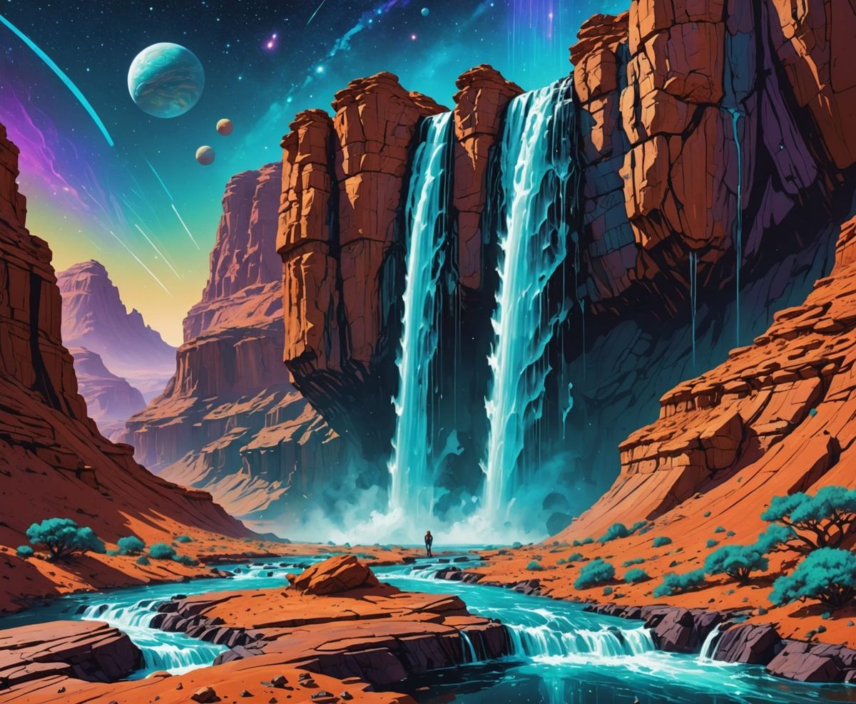 A vibrant image of a waterfall cascading onto a Martian landscape. The artwork is a holographic astral illustration with cosmic elements in a mixed media style.
