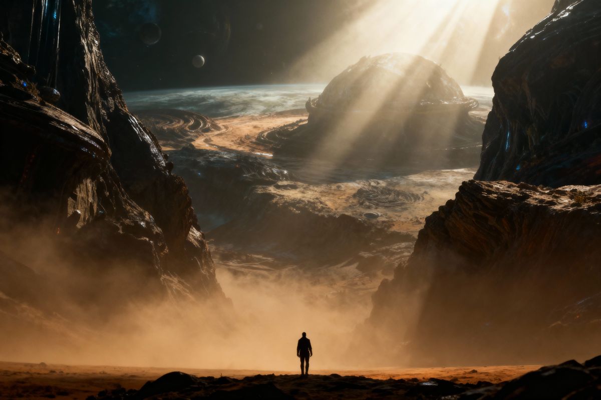 A cinematic image of a solitary figure against a vast alien vista, illuminated by dramatic volumetric light. Features realistic film grain and subtle grading for epic scale.