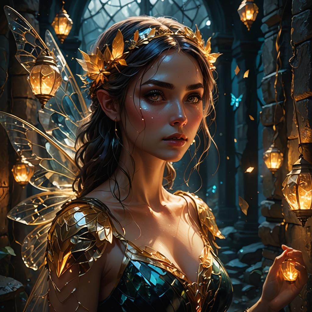 A striking picture of a fairy surrounded by floating glass shards. The fairy's eyes glow brightly in the darkness. The image is highly detailed with a matte painting quality and deep color, in a fantasy art style.