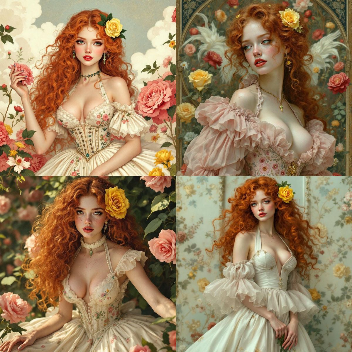 This image shows a woman in a rose-themed puffy dress with a halter top. She has red curly hair, a yellow rose hairpin, freckles, and heterochromia iridum eyes.