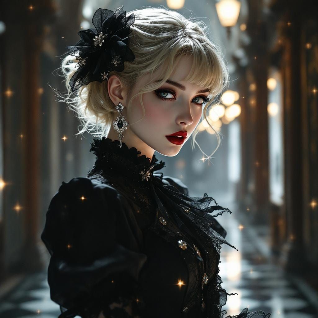 This image features a 1950s-style blonde woman in a maid cafe aesthetic, rendered with dramatic shadows and hyper-detailed lace. The artwork evokes a blend of Gothic elegance and performative sweetness.