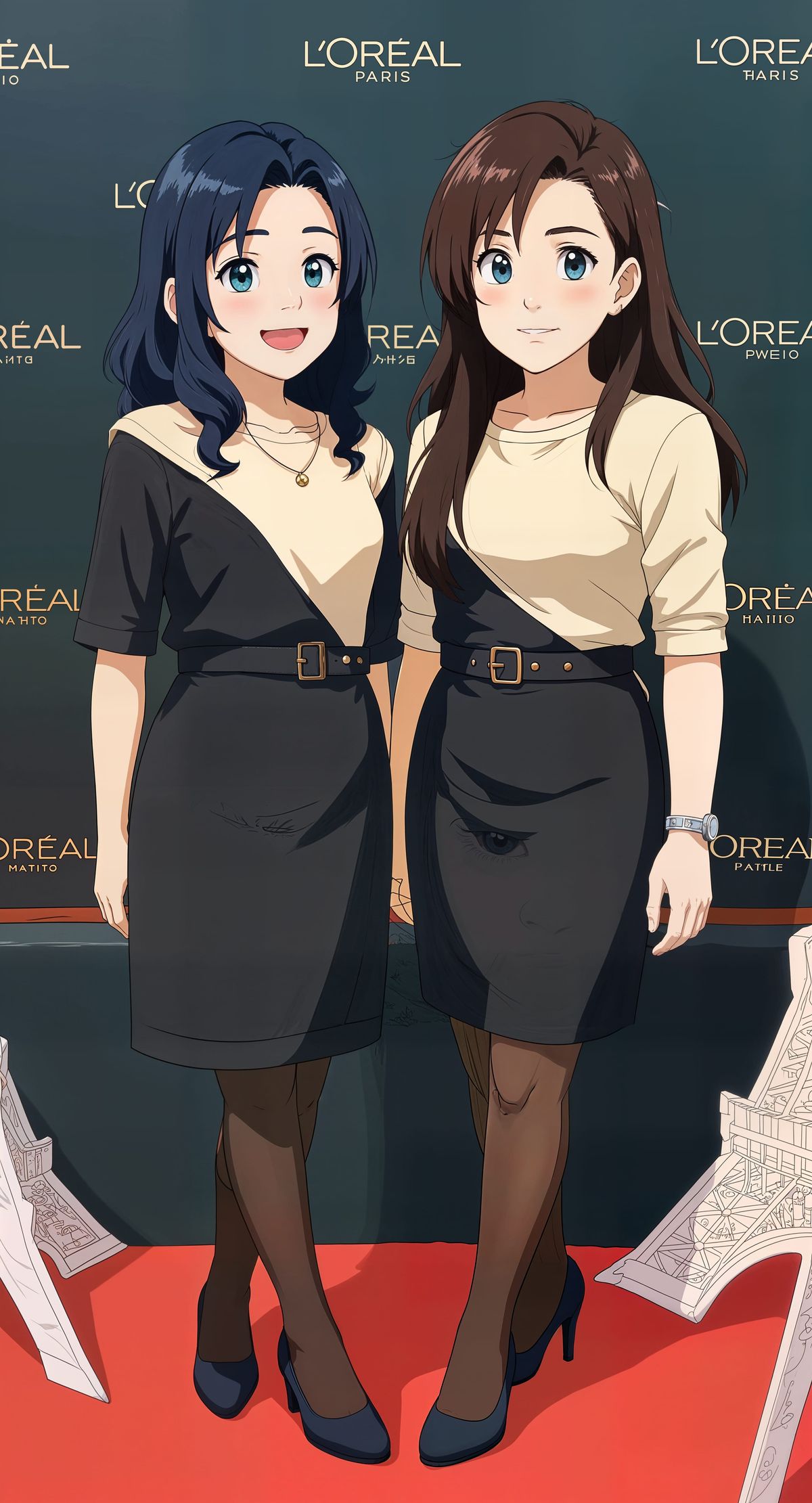 This image shows two beauty advisors in black nylon pantyhose. The style evokes the whimsical feel of a Studio Ghibli anime, with soft lines and a focus on character.