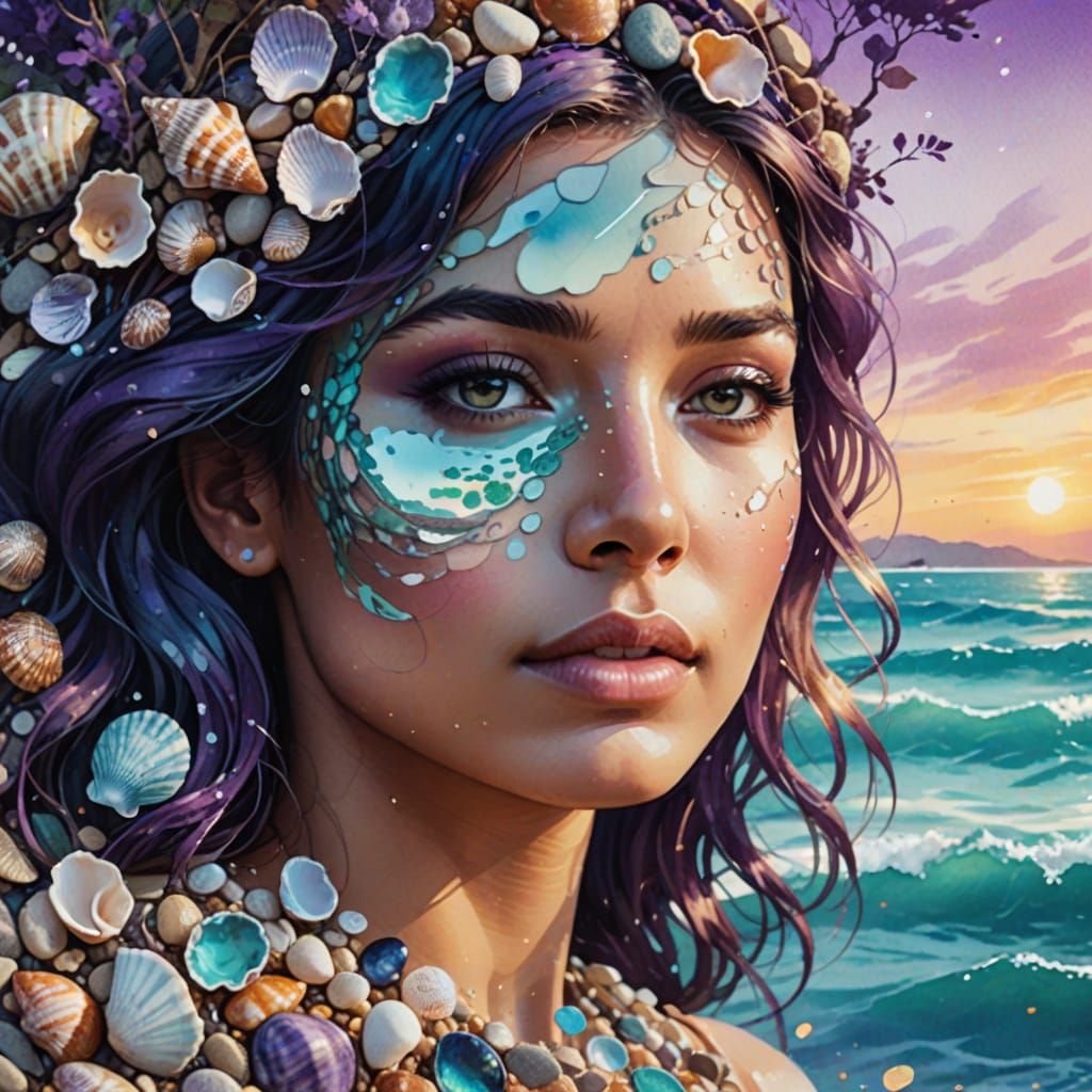 This image shows a woman's face composed of natural elements: water, stones, shells, and trees. The double exposure artwork features dreamy watercolor effects with turquoise and purple tones.