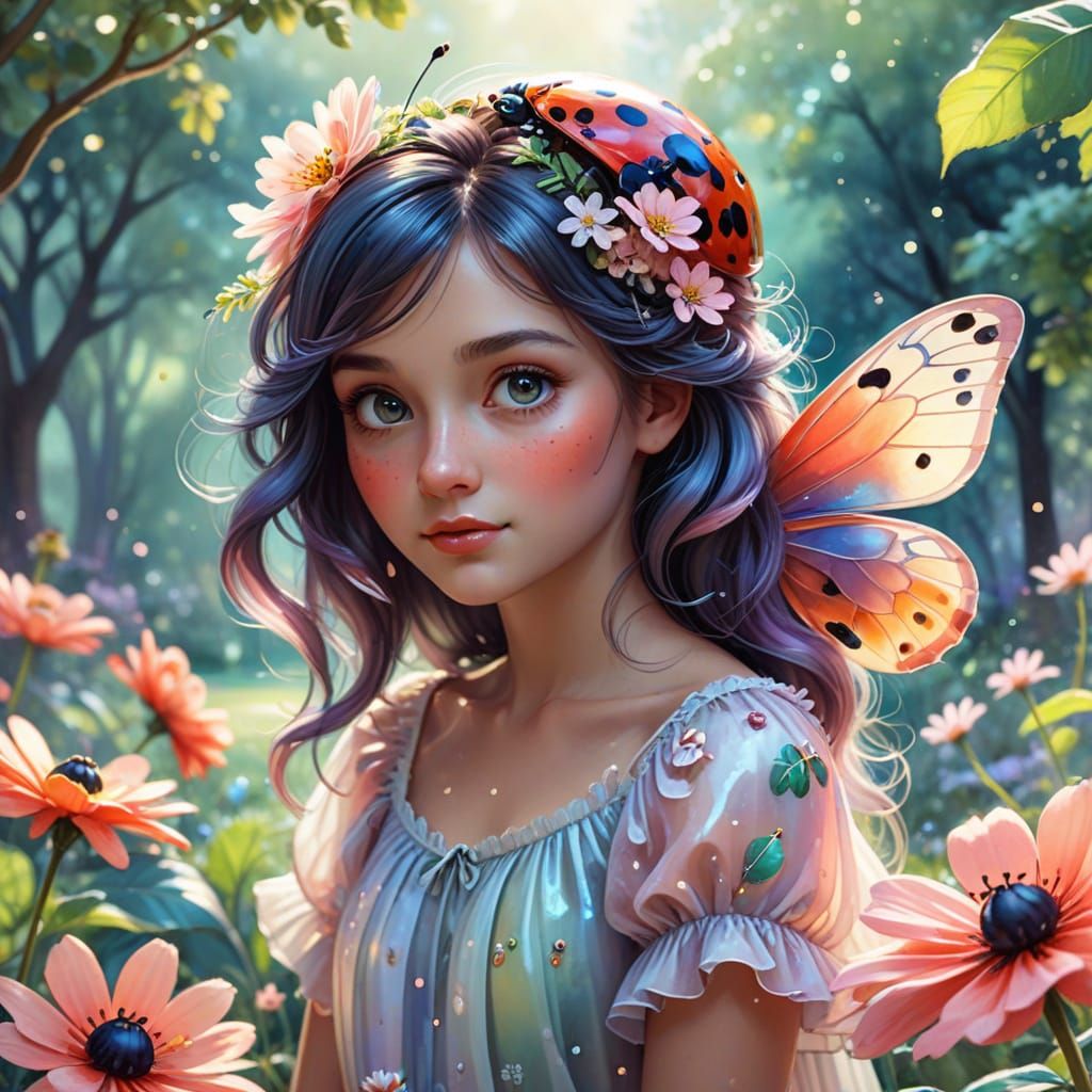 A charming watercolor painting of a girl and a ladybug in a park bursting with oversized flowers. The art features a gentle pastel palette and a glossy, cartoon-like finish.