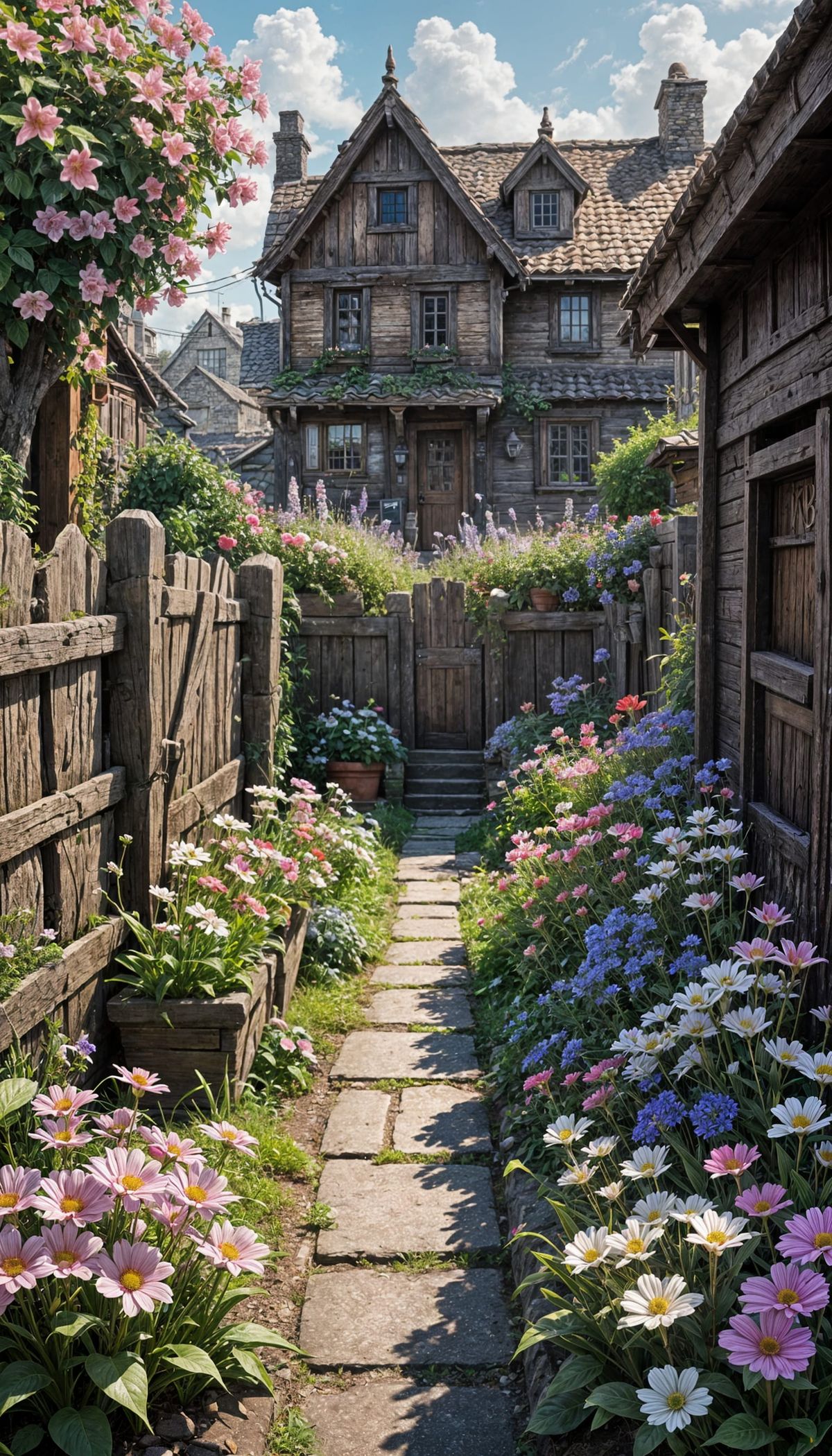 This image depicts Aerith Gainsborough's humble wooden house in the Sector 5 Slums, surrounded by a lush, vibrant wildflower garden. Soft light filters through the slum haze onto the colorful blooms and rickety fence.