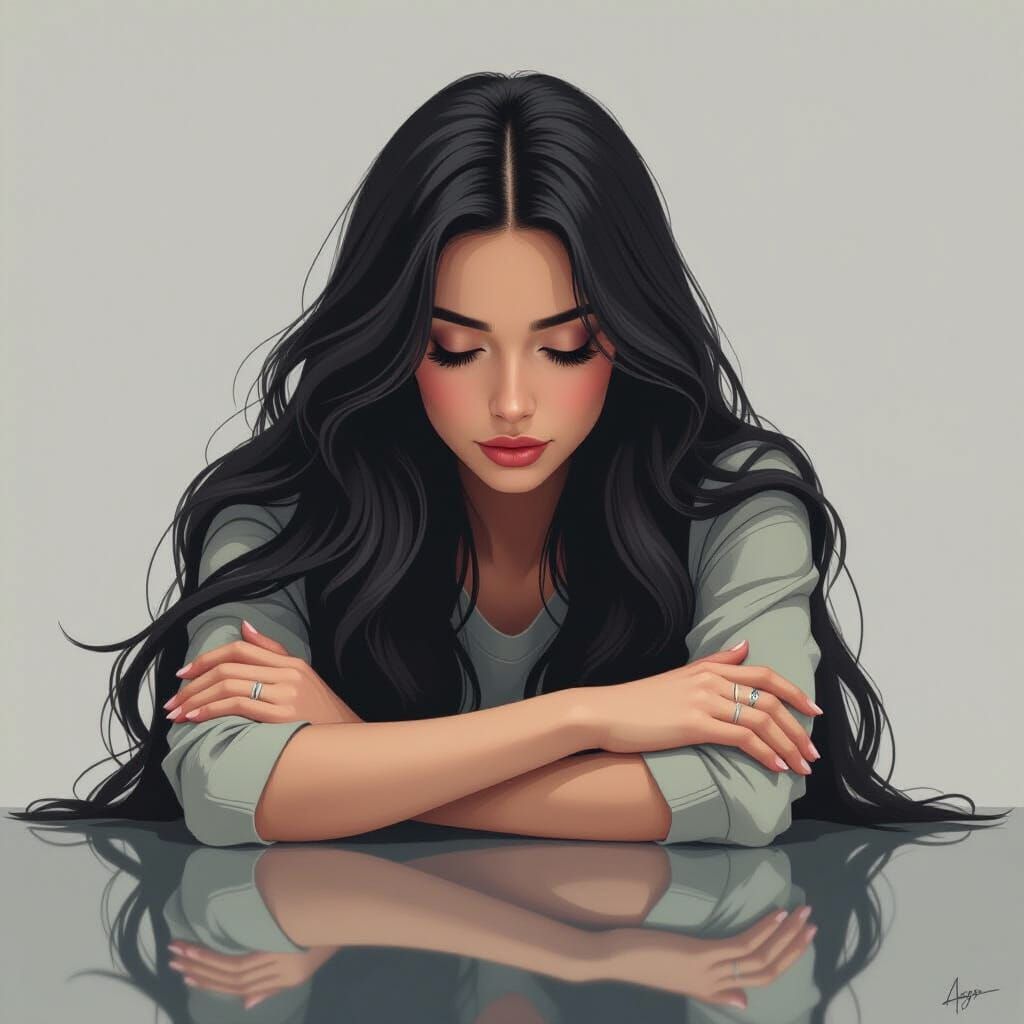 A grayscale sketch of a person with long hair and closed eyes, resting their head on crossed arms. The artwork evokes a melancholic mood with soft lighting and textured pencil strokes.