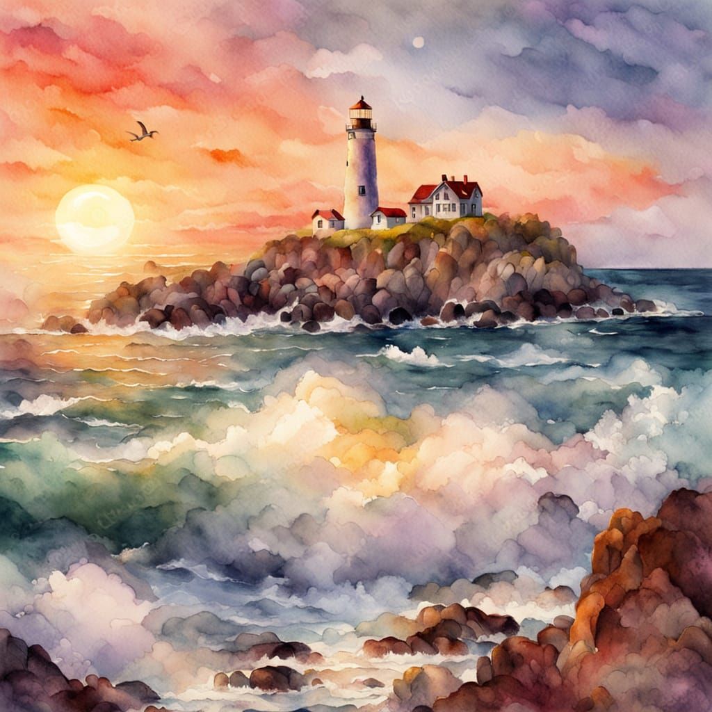 Create your own dramatic coastal scenes in a watercolor painting style. It's free and easy with our AI image generator!