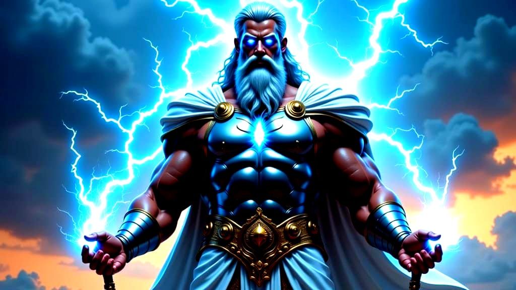 A dynamic painting of Zeus, king of the Greek gods, in ornate armor and regal attire, surrounded by intricate fractal light patterns and radiating divine energy.