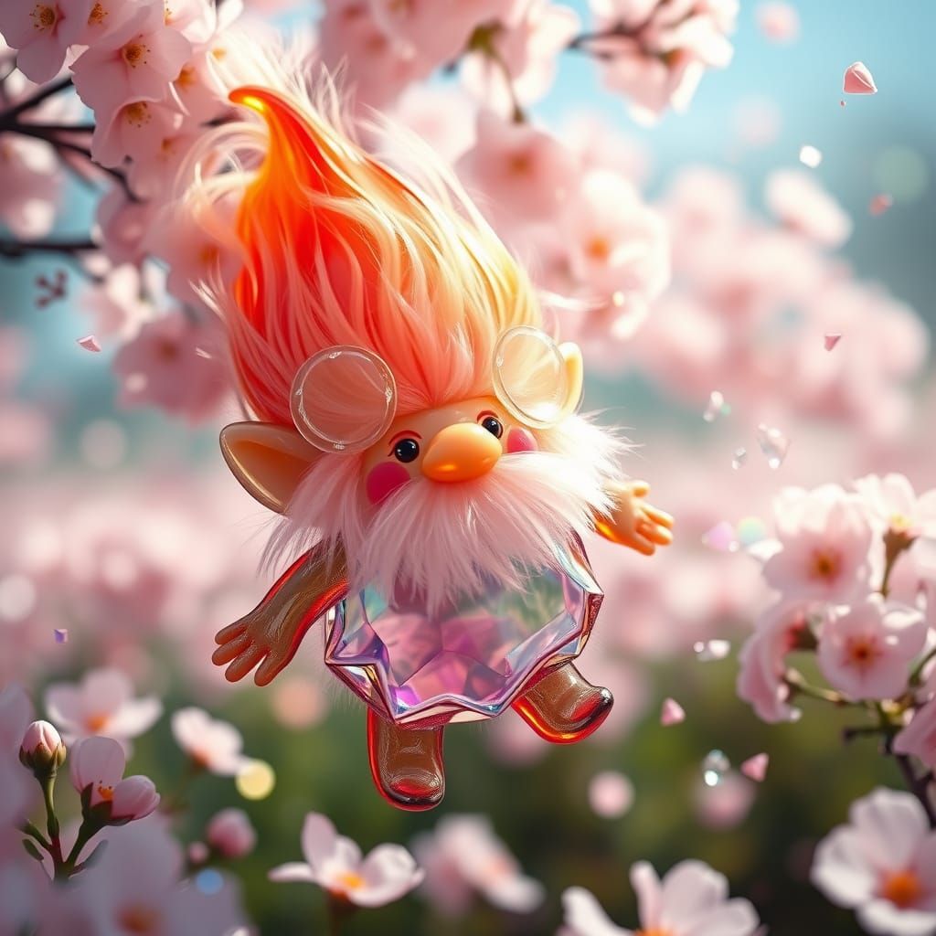 A whimsical glass troll floating through a cherry blossom field. The artwork features vibrant colors, geometric shapes, and dynamic movement in a kaleidoscope of hues, reminiscent of abstract expressionism.