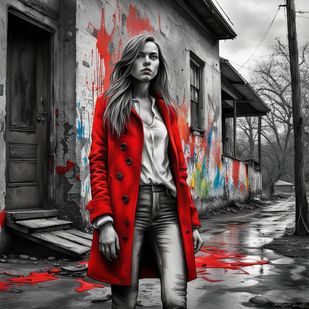 A striking picture of a girl in a red coat. The vibrant color stands out against the muted tones of an old house in the background, rendered as graffiti art with high contrast.