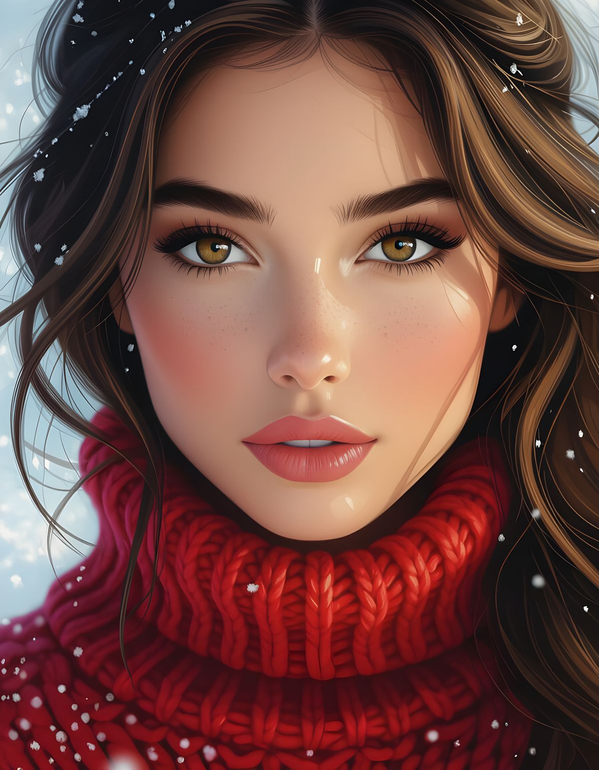A detailed portrait of a young woman in a knitted dress, with light brown eyes, set against a snowy backdrop. The image is reminiscent of pulp adventure art, using bold colors and fluid acrylic techniques.