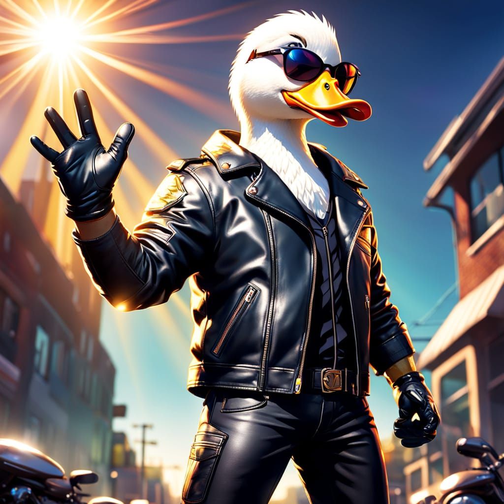 This image shows a close-up, comic book style illustration of an anthropomorphic duck. The duck is dressed in biker attire with sunglasses, rendered with vibrant colors, edgy shading and golden hour lighting.