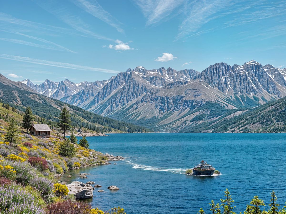 This stunning image captures a serene lakeside scene with rocky mountains, a tranquil lake, and a charming fishing shack. The vibrant colors and incredible detail bring the landscape to life.