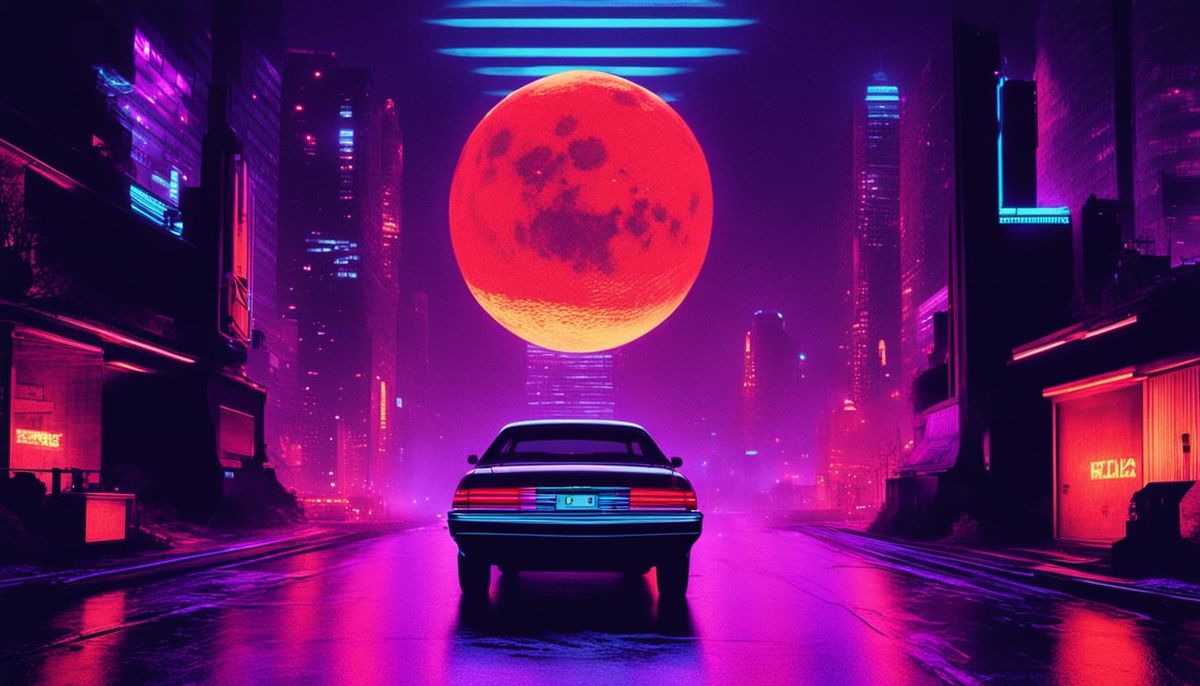 This image shows the Marilyn Monroe towers at night. The composition is reminiscent of a dark, grainy VHS aesthetic. Neon lights illuminate a futuristic, dystopian scene with metallic curves and a haunting atmosphere.