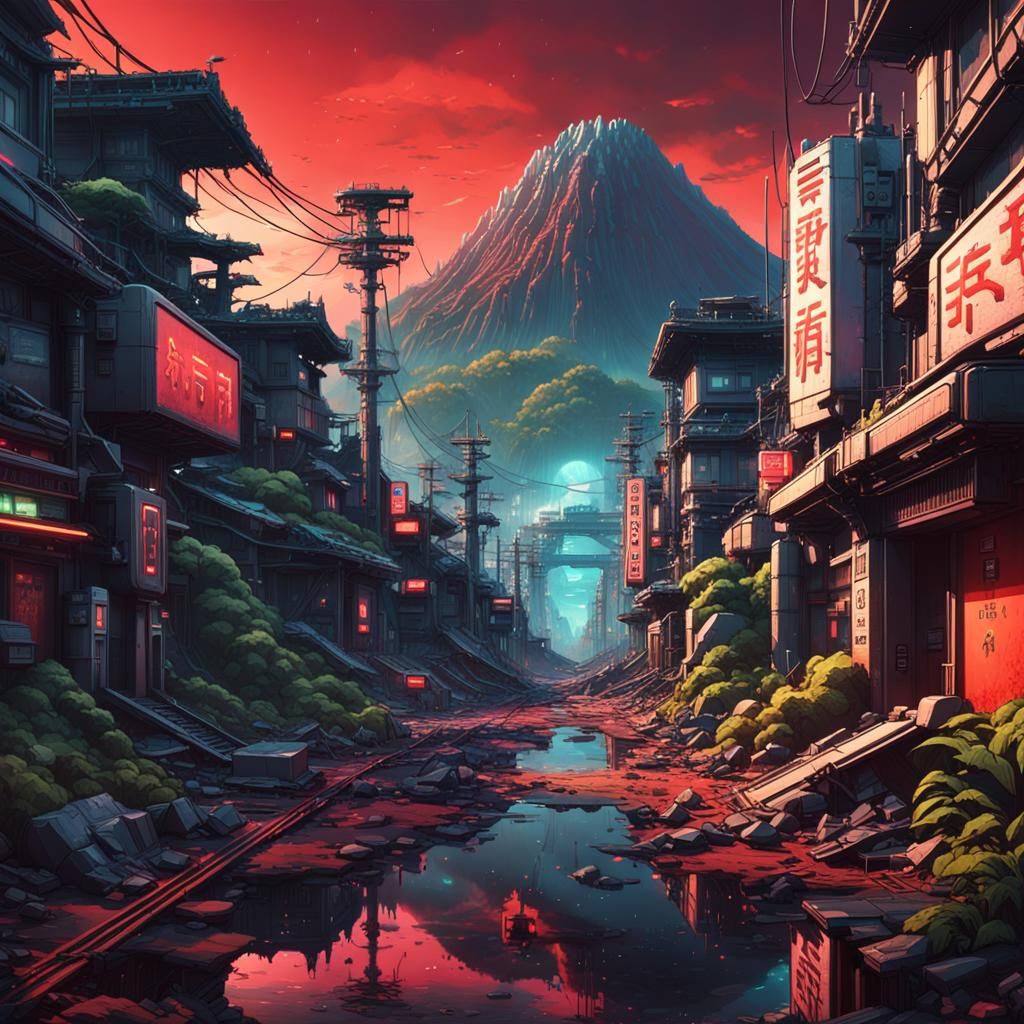 A stunning image of a ruined Japanese city reclaimed by nature. Sci-fi elements like neon lights pierce through the dense fog, all set against a dramatic red sky in a cinematic style.