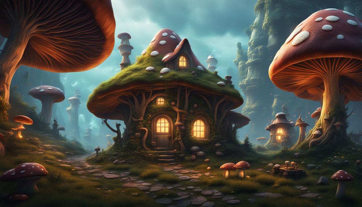 This image shows fantastical mushroom houses in a vibrant, detailed matte painting style. It features deep colors and intricate details, reminiscent of fantasy concept art in 8k resolution.