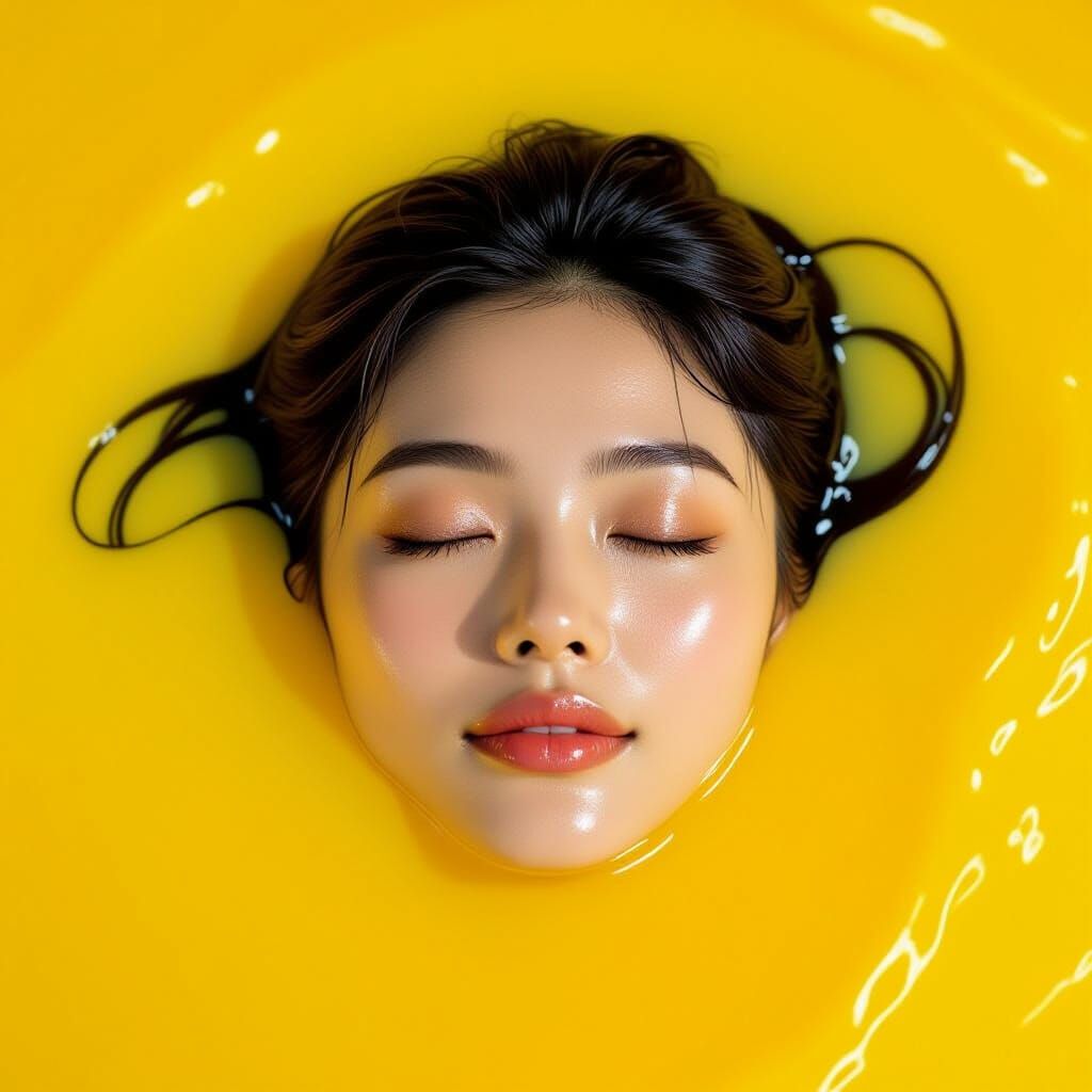 This image shows an Asian woman immersed in a pool of bright yellow liquid. Her eyes are closed in peaceful surrender, captured in a highly detailed and photorealistic style with studio lighting.