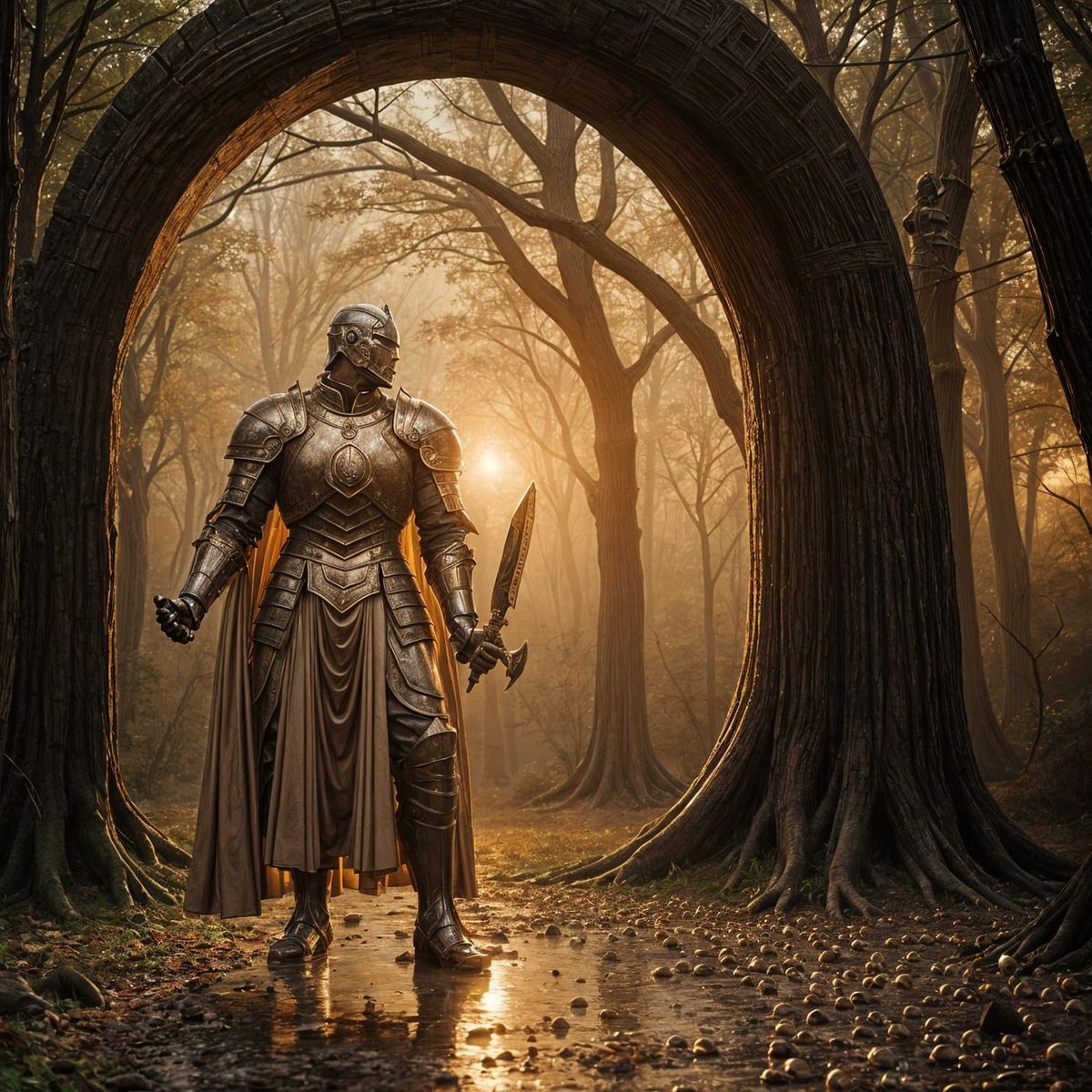 This image depicts a majestic knight in detailed, acorn-inspired armor guarding a colossal mystical portal. Cinematic lighting and volumetric effects create an atmospheric, hyperrealistic fantasy scene.
