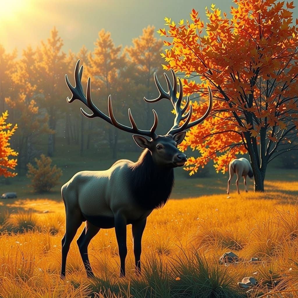 A majestic elk stands in a vibrant autumn meadow bathed in warm, ethereal sunlight. The scene features hyperdetailed trees with golden foliage and volumetric lighting, creating a magical, atmospheric quality.