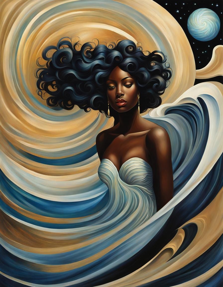 A striking picture of a Black woman emerging from a seashell on a moonlit beach. Galaxies swirl in the background in this art deco style painting.
