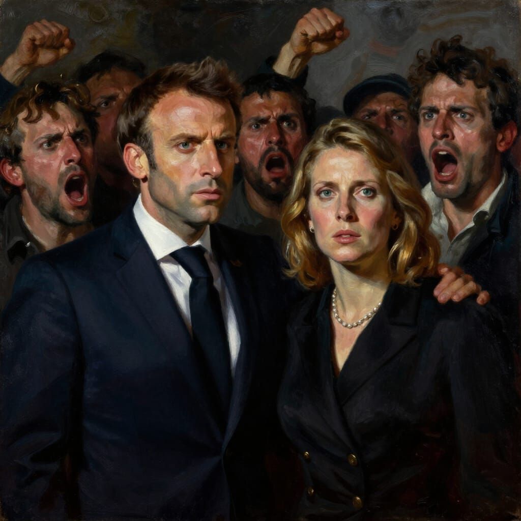 This image shows Emmanuel and Brigitte Macron appearing concerned amidst a chaotic scene of enraged citizens. The dramatic oil painting uses bold strokes and chiaroscuro lighting to convey intense emotion and social commentary.