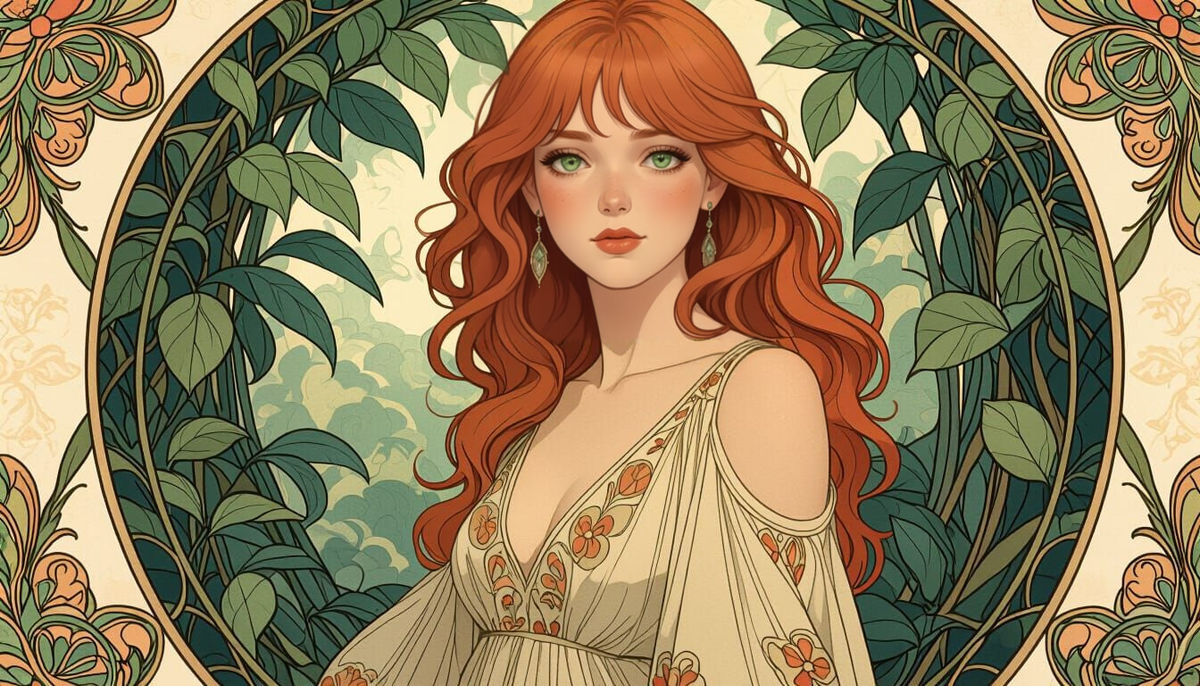 "Art like style, painting like style, (((nouveau art style)))((cozy painting style)), young women with green eyes red hair with curtain bangs, (fantasy vibes,)"