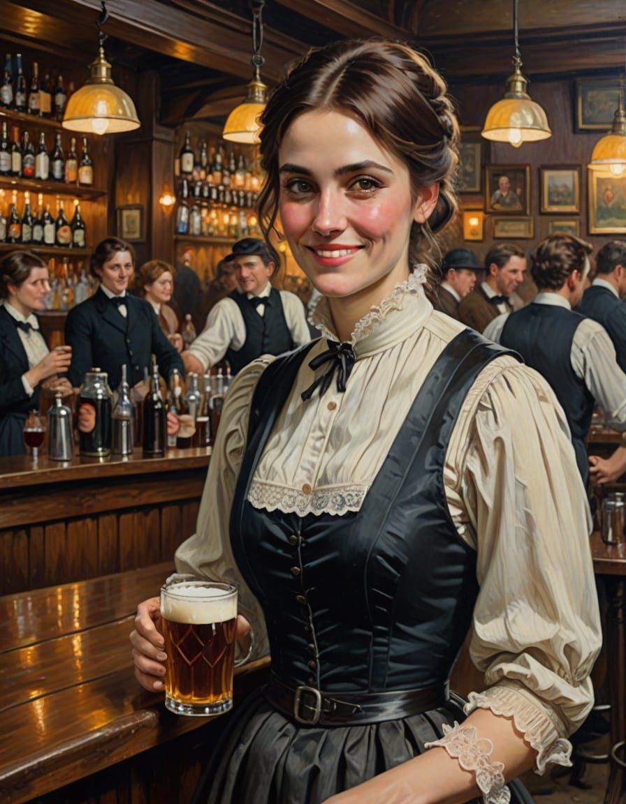 A striking picture of a Victorian woman at a bar, smiling shyly while holding a beer mug. The artwork is rendered as an oil painting on canvas.