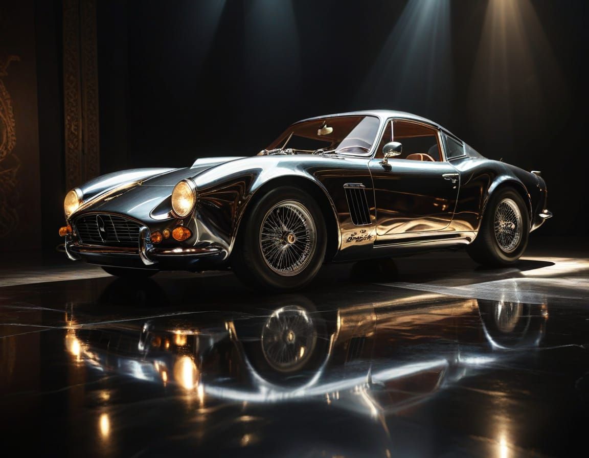 A striking picture of a classic Italian sports car dramatically lit on a dark stage. The image uses bold contrasts and golden accents in a baroque aesthetic, with reflections on chrome and detailed leather.