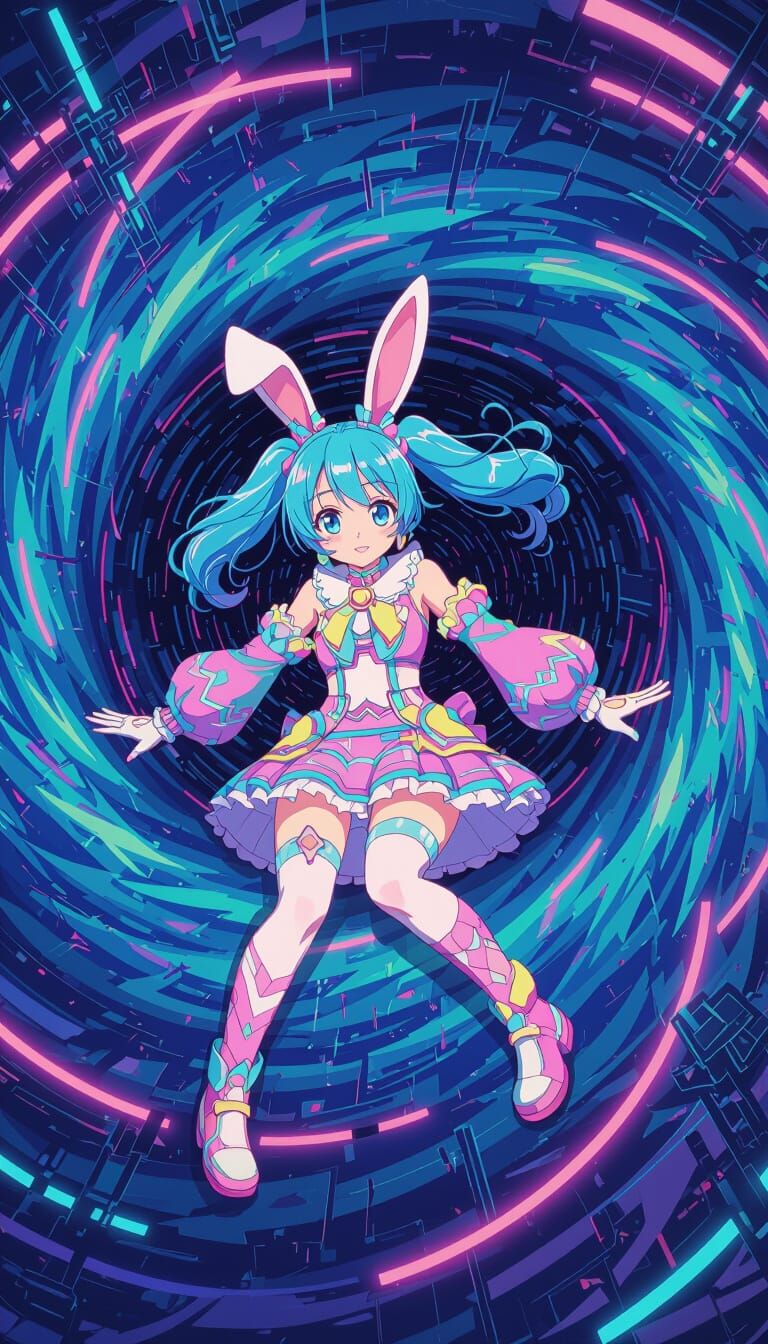 This image shows Miku in a pastel outfit falling into a rabbit hole. The scene features swirling patterns and neon lights, presented as vibrant digital art with futuristic landscapes.