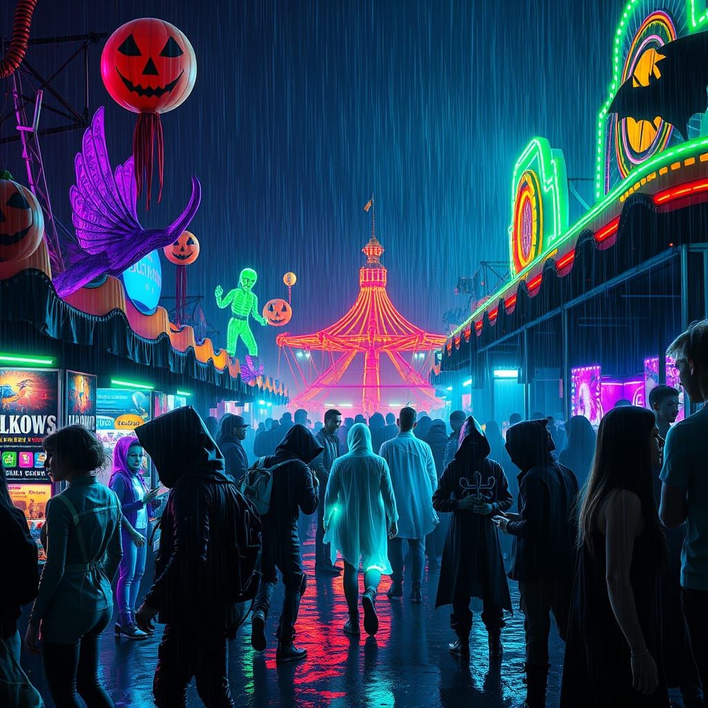 A dark, rainy carnival at night, filled with people in futuristic attire and Halloween decorations, illuminated by vibrant neon lights in a cyberpunk aesthetic.