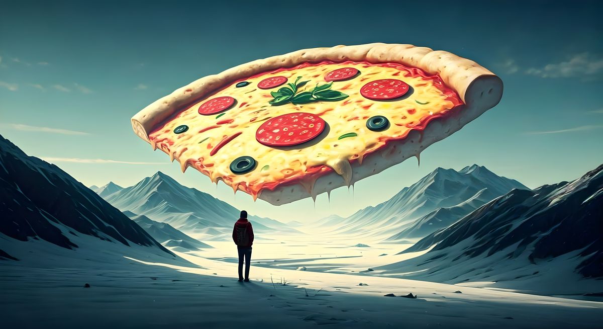 In a surreal, dreamlike winter landscape bathed in cold blue, ethereal light, an intricate, gigantic abstract sculpture of a three-dimensional pizza dominates the horizon. The pizza's edges and surfaces are meticulously defined by swirling lines and jagged edges, creating a mesmerizing depth of field. ...