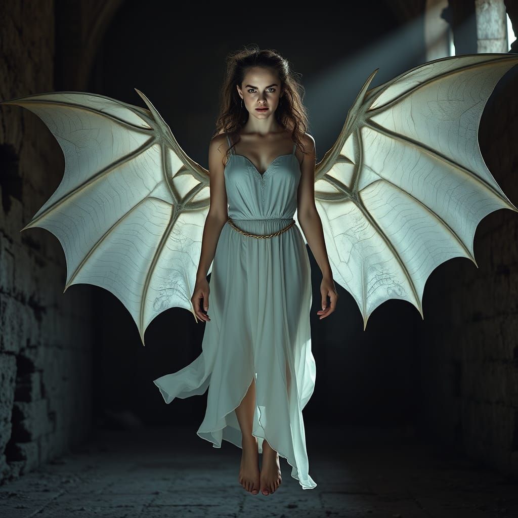 This haunting image captures a supernatural woman with bat wings, floating in a ruined castle chamber. Her pale skin, sharp eyes, and mysterious smile evoke a sense of eerie beauty, set against a backdrop of broken stone and mystical light.