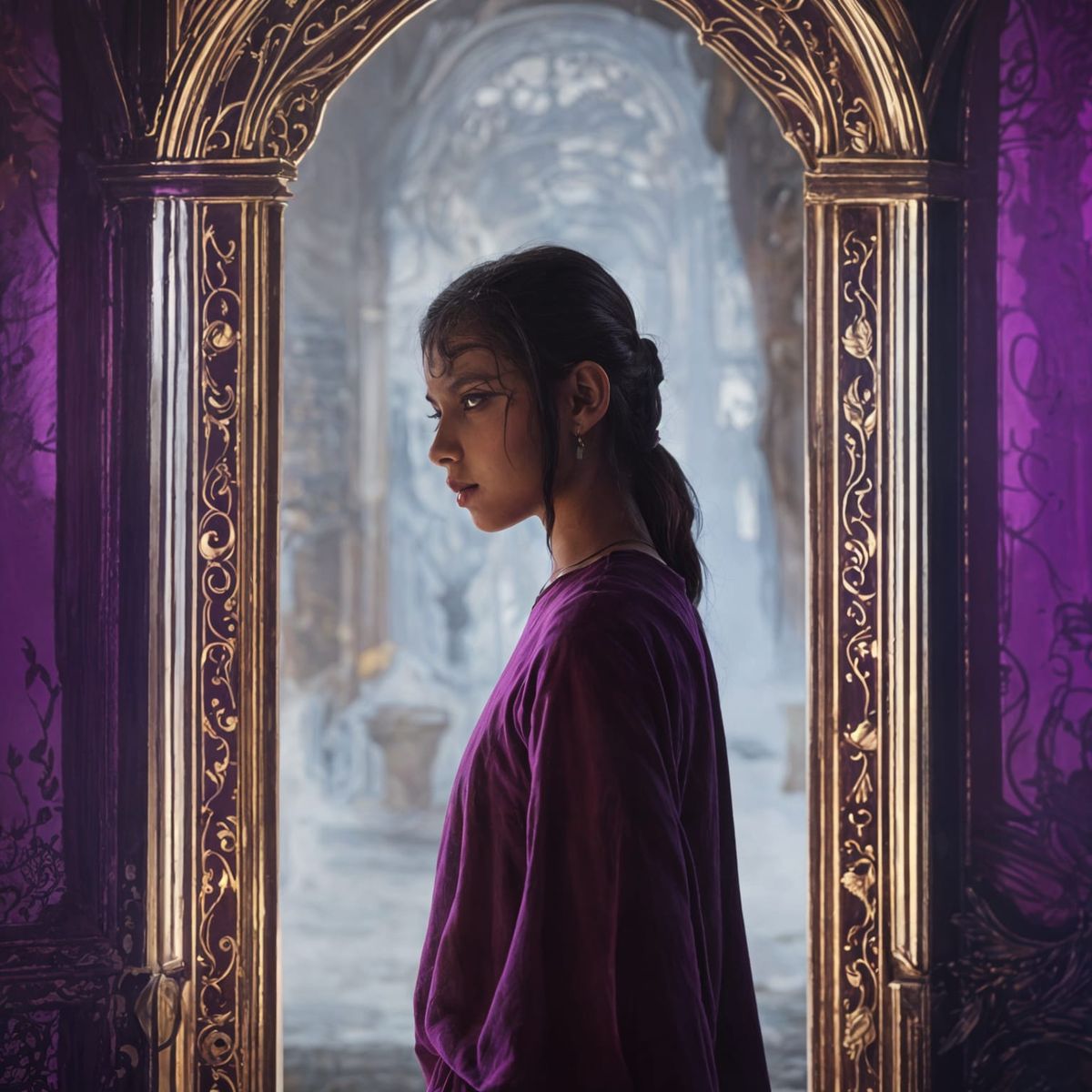 This image shows a book cover with the title "shaapit atma: andhere ki chhaya". The cover features a girl standing and looking at a portrait of another girl with her head down, as a detailed matte painting.
