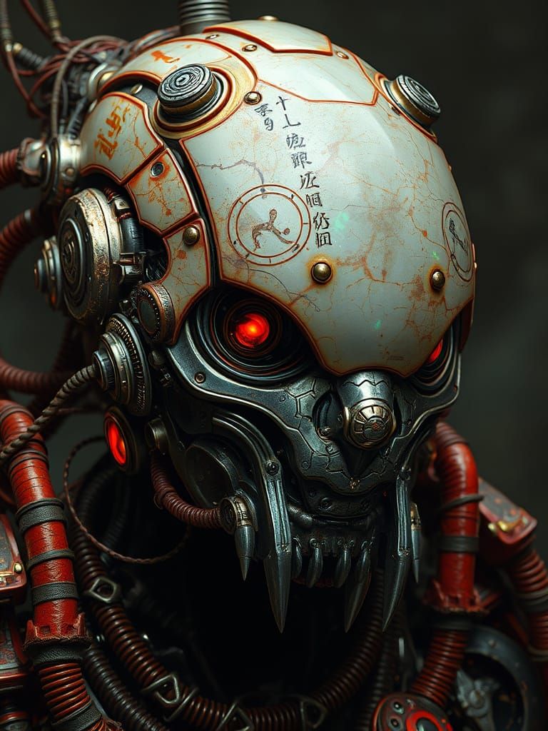 This image depicts a striking cyberpunk female figure with a biomechanic shell and opal armor, blending elements of steampunk and Chinese writing. The detailed, high-resolution artwork showcases a fusion of heavy metal and futuristic aesthetics.