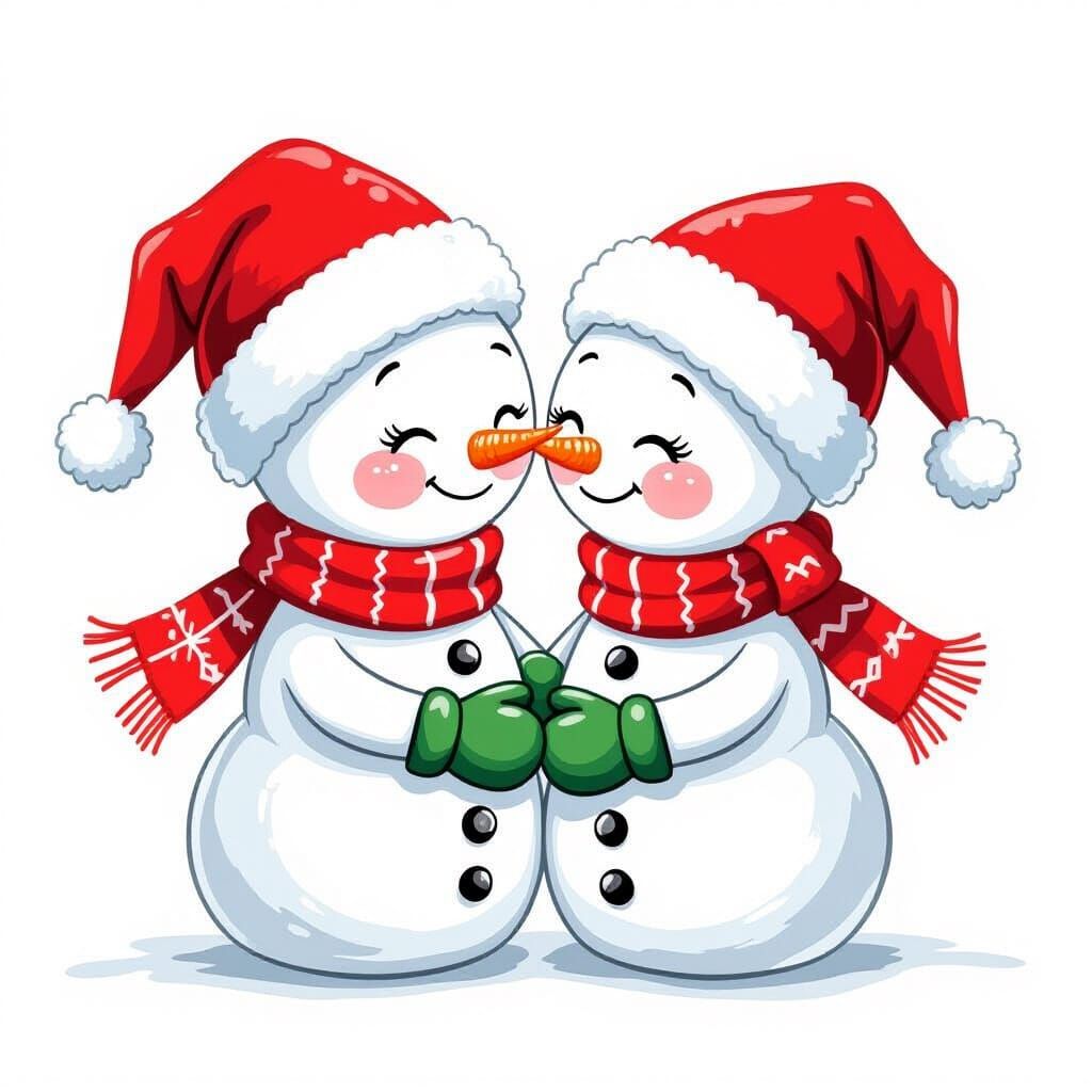 This charming clipart illustration features two adorable snowmen in Santa hats and scarves, holding hands and sharing a tender kiss. The image uses bright, vivid colors in a style inspired by classic children's book illustrators.