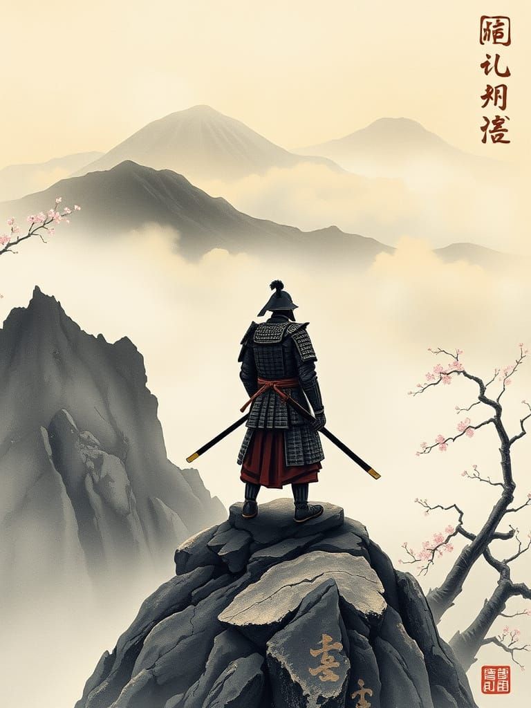 A striking picture of a lone samurai warrior standing guard on a misty mountaintop. The dreamlike landscape below features delicate cherry blossoms and twisted pines, rendered with atmospheric watercolor effects inspired by Sumi-e.