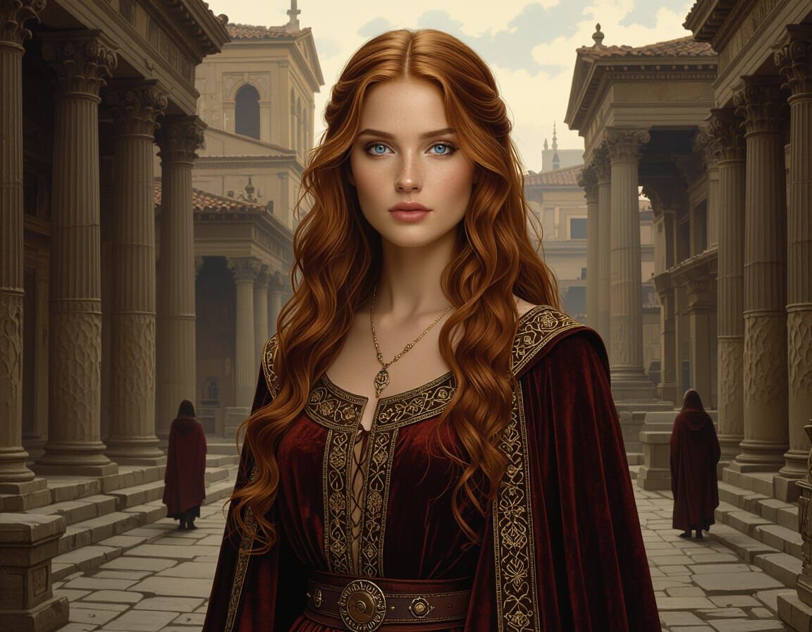 beautiful young woman, honey-copper long hair slightly wavy, blue eyes, fully clothed, rich medieval robes, no clevage or arms showing, no jewelry, demure look, intelligent looking, in a dark background like an ancient roman city with columns and pediments and old buildings, no bright or pastel colors ...