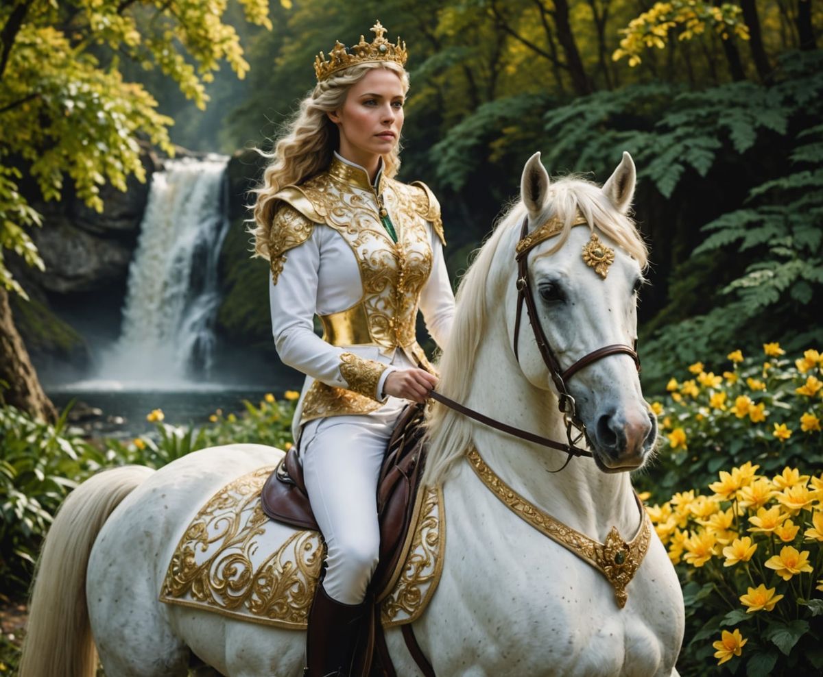 A hyperrealistic painting of a beautiful queen with dark blond hair wearing a gold and white dress and crown. She rides a white Arabian horse in a green wood with a waterfall and flowers.