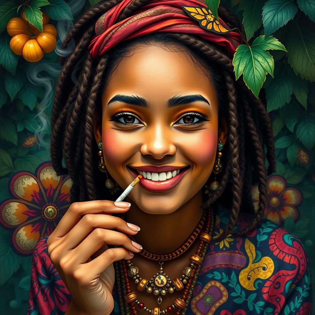 This vibrant image depicts a young woman surrounded by lush greenery and surreal elements, wearing a colorful bohemian outfit with loose dreadlocks and a marijuana cigarette, blending semi-realistic digital art with bold, expressive acrylic painting techniques, featuring visible brushstrokes and textures...