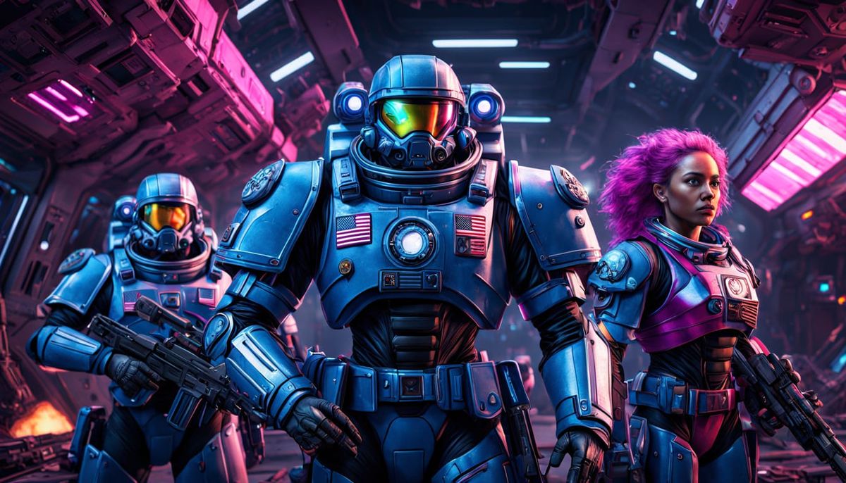 This stunning portrait showcases four individuals from different worlds standing proudly in front of a detailed US spacecraft, with intricate textures and metallic sheen, set against a vibrant blue and magenta backdrop with dynamic lighting and volumetric effects.