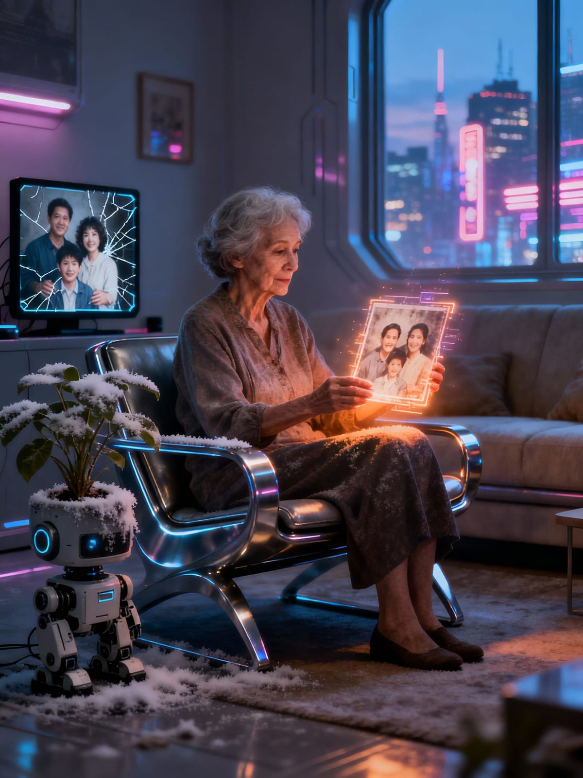 A photorealistic image of an elderly woman in a melancholic futuristic living room, holding a flickering holographic family photo. Cinematic lighting and retro-futurism aesthetic enhance the nostalgic scene.