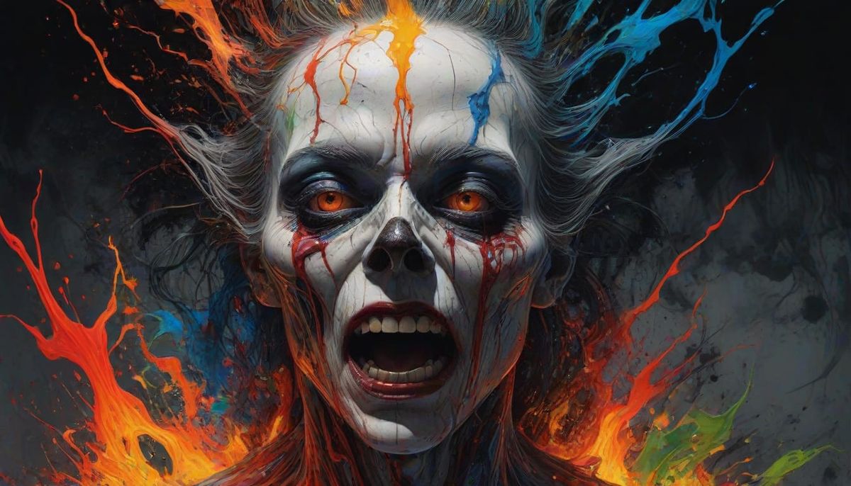 This image showcases a terrifying ghostly vampire amidst a splattered liquid artwork with vibrant brushstrokes, blending horror and fantastical elements in a dramatic and intricate design.