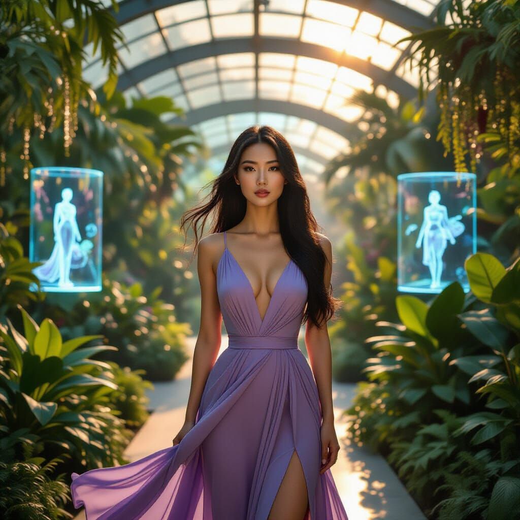 This image shows a Chinese woman in a futuristic garden. Holographic projections and neon accents add to the scene's modern aesthetic, enhanced by cinematic lighting and a vibrant color palette.