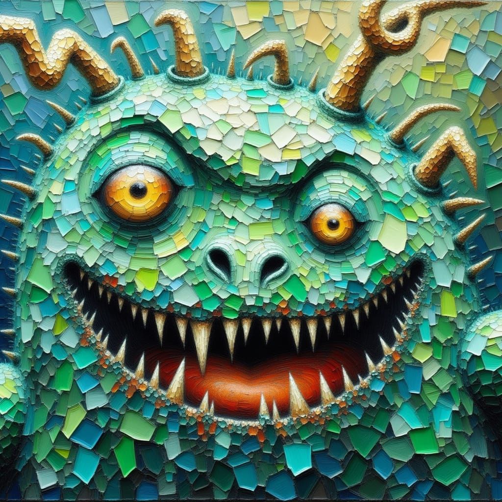 This striking image features a whimsical monster in sea-green and gold, rendered as an expressionist impasto oil painting. It showcases heavy cracked textures and scumbling techniques, creating a dramatic, tactile effect.