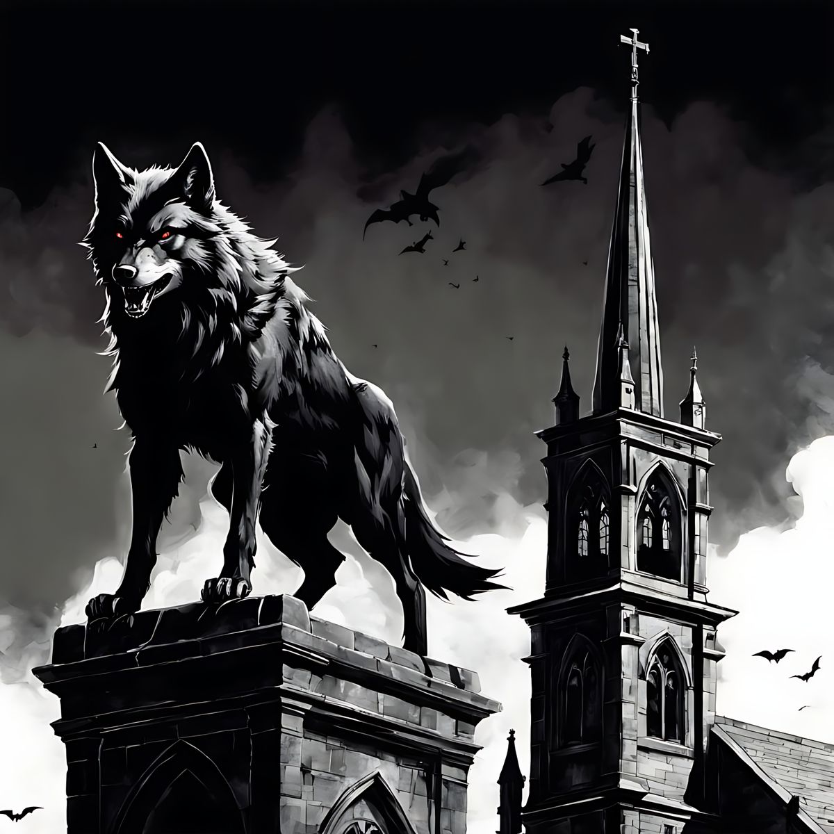 'Horror comic book art depicting a anthropomorphic wolf like male vampire perched on a stone gargoyle atop a towering old abandoned Gothic church spire'. Acrylic ink, scratchy, dated black and white sketch, directional lighting, smudge. Extreme detail, terrifying, sinister, and unnerving.