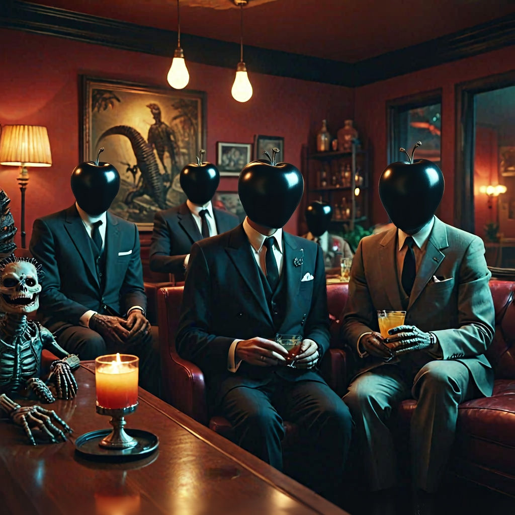 Stylish mod characters gather in a sophisticated mid-century modern interior, enjoying drinks amidst surreal elements like zombies and tiki statues, all rendered in bold, saturated colors.
