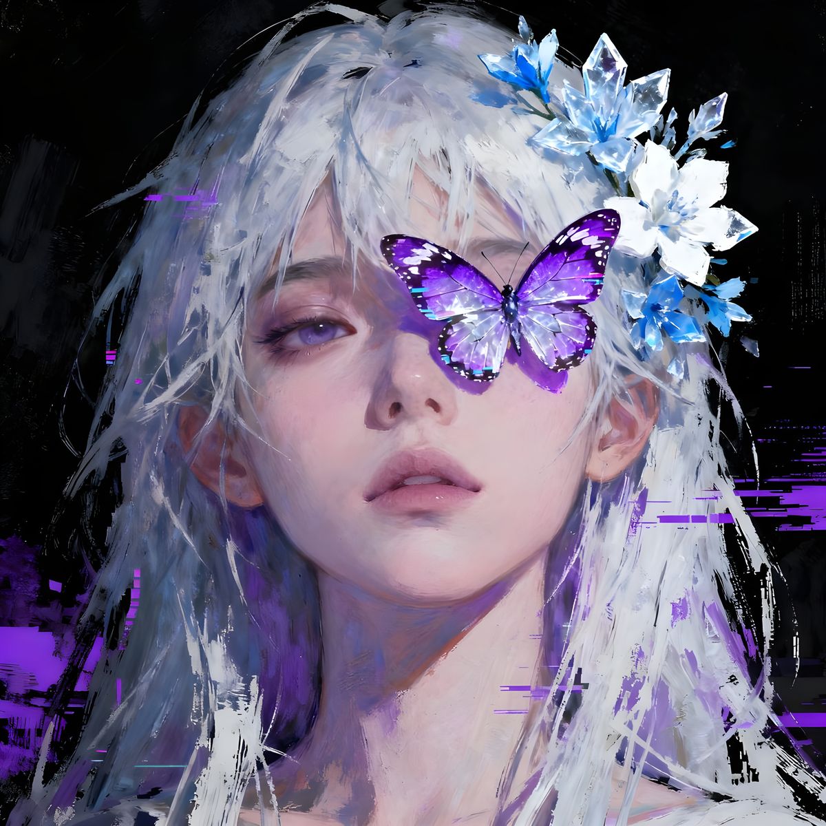 A close-up painting of a woman with an emotionless expression, adorned with ice blue and white flowers and glitching butterflies, presented in a fantasy concept art style with thick, rough paint strokes on a dark background.